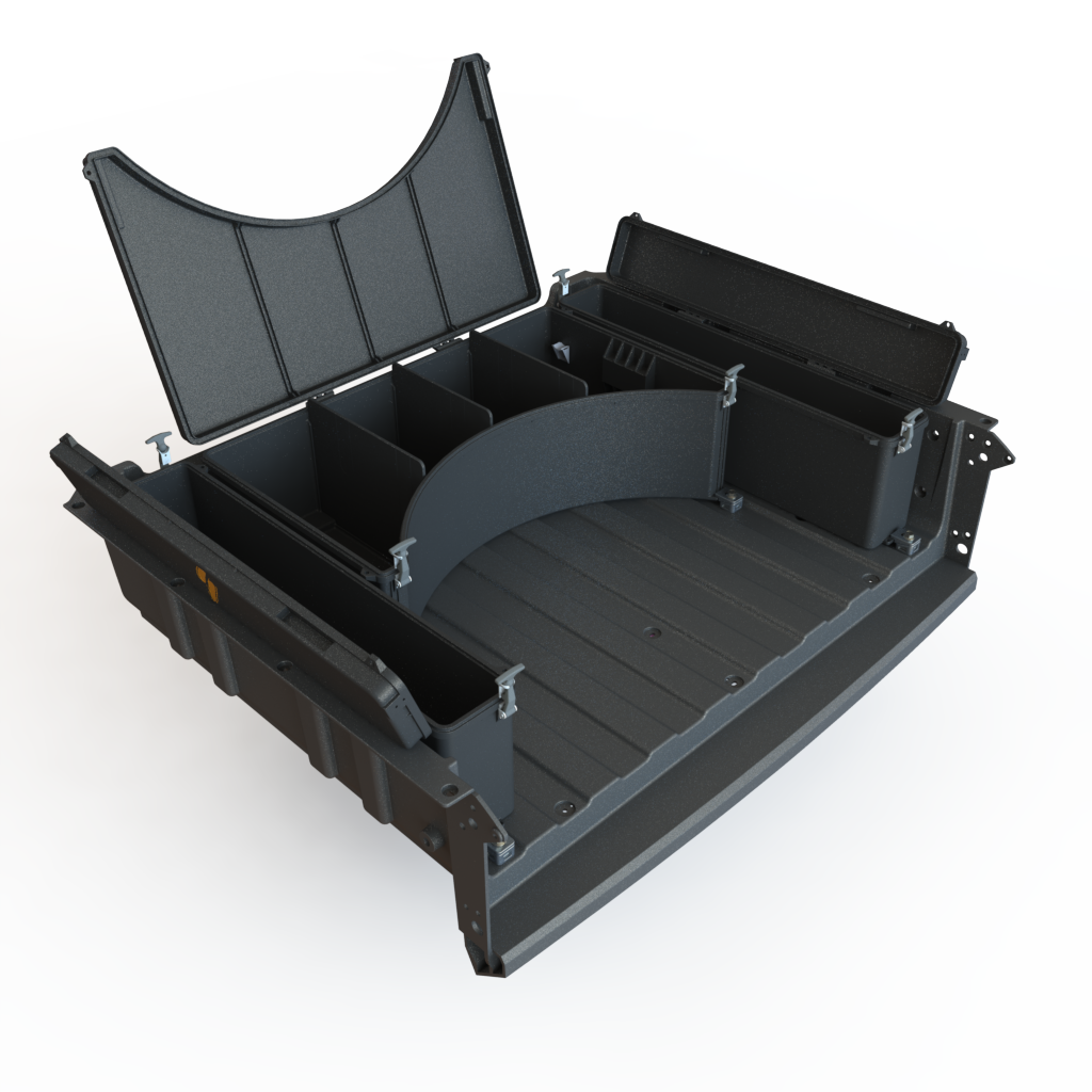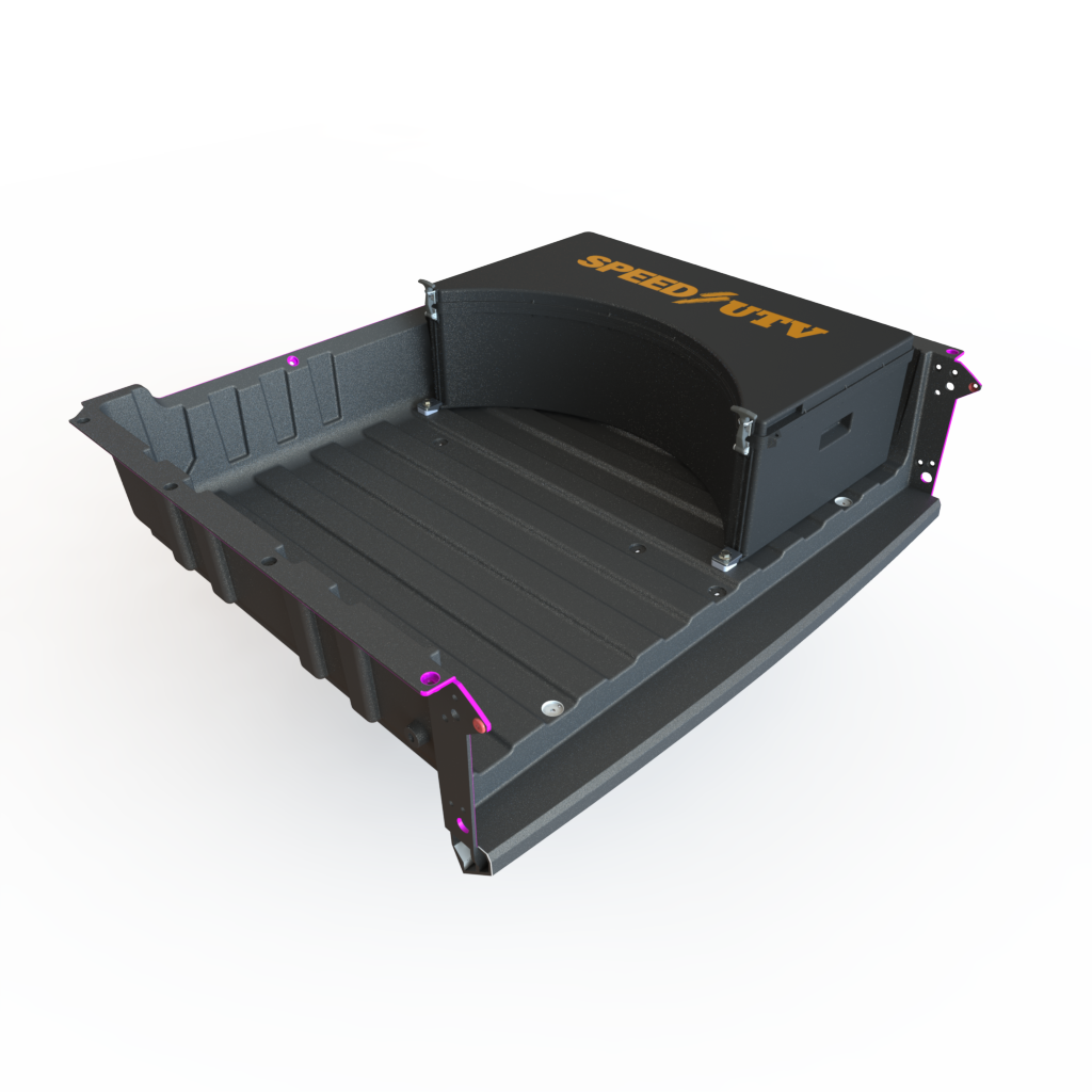 Speed UTV Cargo Box Storage: Storage box fits in factory bed with factory spare tire. Spare Tire and Cargo boxes have multiple configurations.